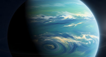An artistic rendering of a massive, turquoise and yellow gas giant exoplanet, featuring swirling clouds, atmospheric storms, and faint rings. The planet is partially shadowed, set against the blackness of deep space, evoking a sense of cosmic discovery.