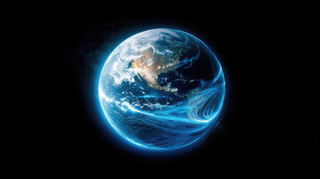 Isolated view of Earth with blue and green tones vivid against black, clouds swirling around continents and oceans