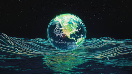 A stunning digital representation of the Earth, surrounded by glowing waves under a starry sky. This artistic piece captures the beauty of nature and technology.