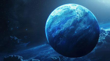 Futuristic exoplanet with glowing blue oceans and swirling cloud formations in deep space. Generative AI