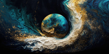 Abstract background of deep space. Acrylic paints and gold glitter. Marble appearance. current art