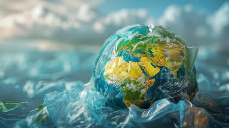 This striking image showcases Earth entangled in plastic waste, emphasizing environmental challenges. The dramatic sky symbolizes urgency in addressing pollution.