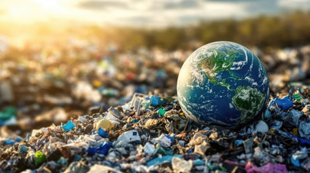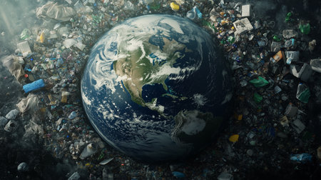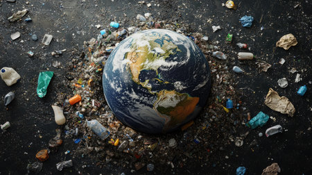 A dirty planet Earth engulfed in garbage and plastic, highlighting the urgent need for environmental action