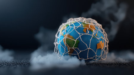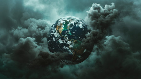 A globe, enveloped in smoke and debris, symbolizes the devastating effects of environmental catastrophe on our planet.
