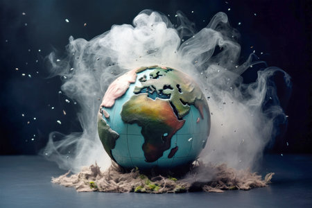 A globe, engulfed in smoke and debris, symbolizes the devastating consequences of an environmental catastrophe on our planet.