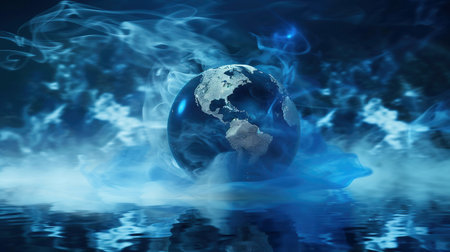 A glass globe sits on a reflective surface, surrounded by swirling blue smoke. The image evokes themes of the environment, climate change, and fragility