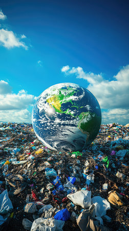 Powerful image showing planet Earth perched atop a pile of plastic waste emphasizing the contrast between the beautiful Earth and the surrounding pollution