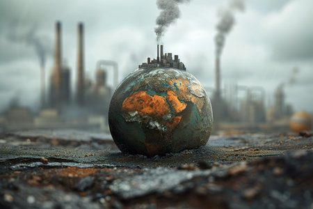 A surreal image of earth with industrial structures on the surface, emitting smoke against a backdrop of a polluted landscape. Concept of environmental degradation form industrialization impact. Generative AI.
