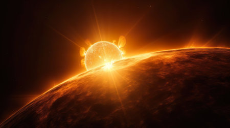 Blazing planet radiating intense heat and brilliant light, surrounded by a fiery atmosphere and shimmering distant stars, crafting a striking and dramatic cosmic scene