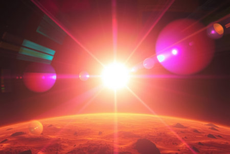 A breathtaking view captures a red planet softly lit by a nearby bright star. The scene presents a cosmic dance of celestial bodies against the dark backdrop of space.