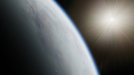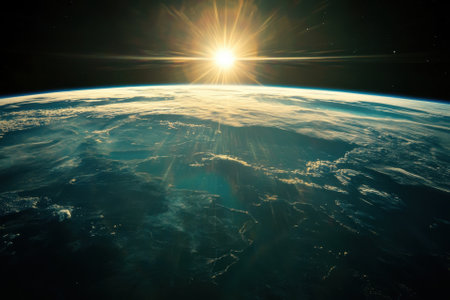 Earth sunrise from space over cloudy ocean. 3d rendering illustration