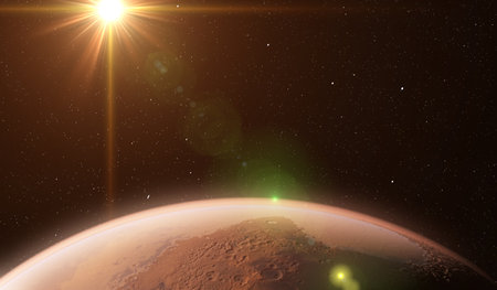 Wide view of red planet mars with mountains and sun from space during sunset or sunrise with copy space, science or space exploration background, 3D illustration