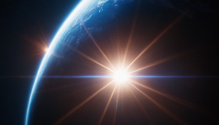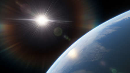 Sunrise over the planet Earth with lens flare. 3D rendering