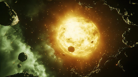 A stunning cosmic scene featuring a luminous sun at the center, surrounded by orbiting planets. This illustration captures the beauty of space and celestial mechanics.