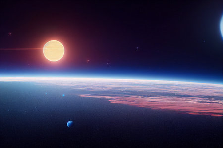 Cosmic landscape with celestial bodies and planetary horizon