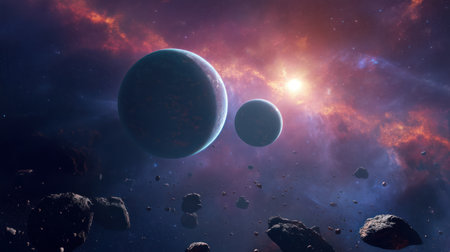 This high-resolution image captures a breathtaking cosmic scene with distant planets, floating asteroids, and a shimmering nebula, evoking a sense of wonder and exploration.