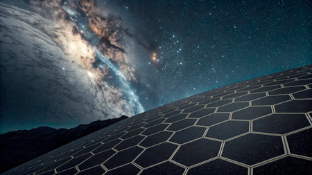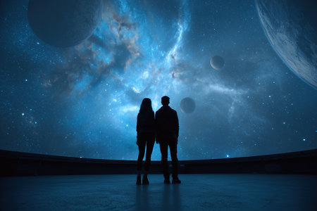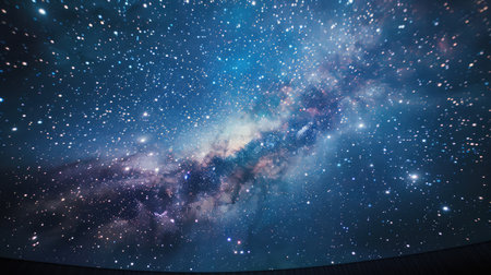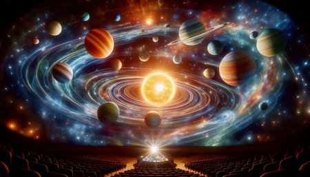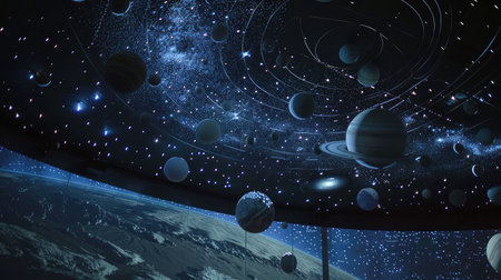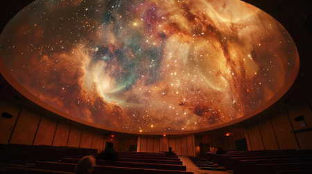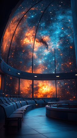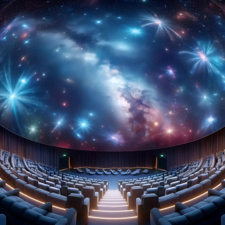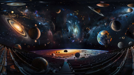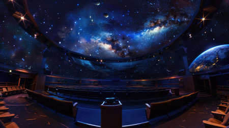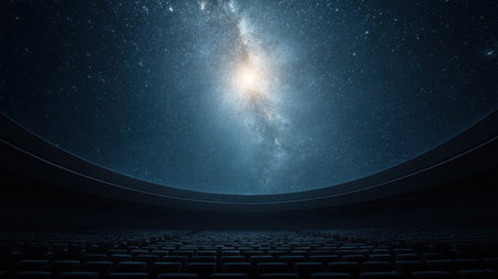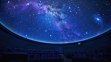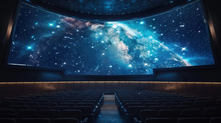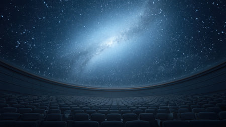 Experience a breathtaking digital projection of the cosmos in a modern planetarium theater, featuring a vast display of stars, galaxies, and nebulae for educational and immersive exploration.
