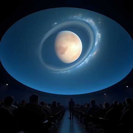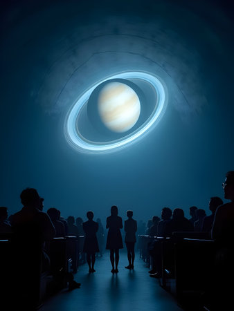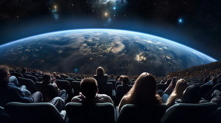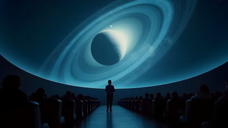 Planetarium audience in awe, ultra-wide, cosmic display immersion.