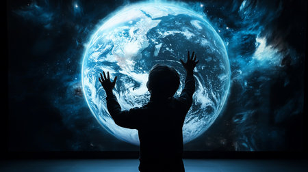 A child's silhouette reaches towards a luminous Earth projection set against a cosmic backdrop, evoking wonder and hope for the future of our planet.