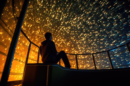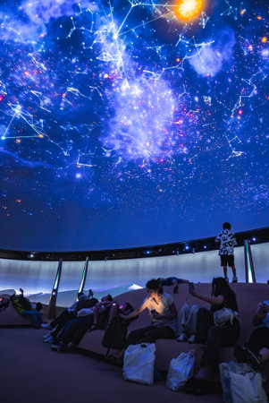 Exploring the night sky through a digital projector in a planetarium. Concept Night Sky Exploration, Digital Projector, Planetarium Experience, Stargazing Adventure