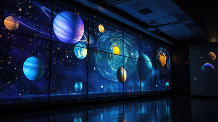 A stunning futuristic interior showcasing vivid celestial projections, creating an immersive space experience with planets, stars, and cosmic elements.
