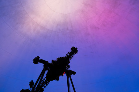 Planetarium projector, advanced technology, celestial images (close up, focus on, copy space) Double exposure silhouette with universe