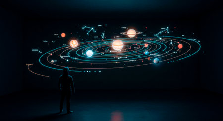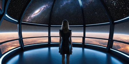 A person stands in awe inside a planetarium, surrounded by stunning, high-resolution imagery of distant planets and stars.