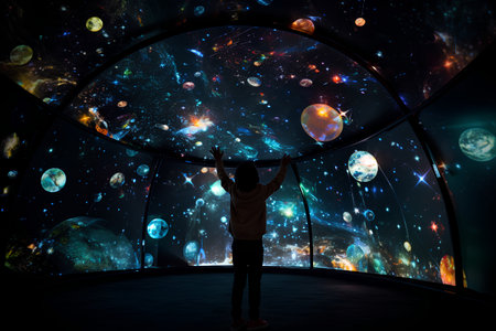 A young child reaches out to a mesmerizing display of stars and galaxies in a planetarium.