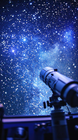A telescope is pointed towards the sky, capturing a brilliant expanse of stars and cosmic phenomena in a serene and dark environment during the night.