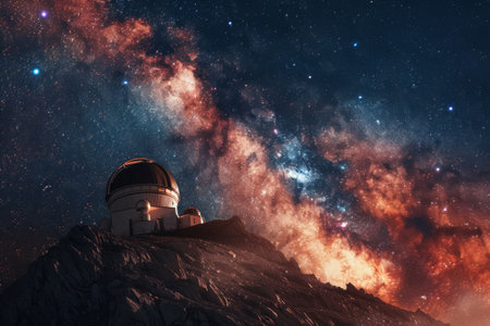 Astronomical observatory stands on mountain under clear starry sky with vibrant galaxy. Concept of space exploration