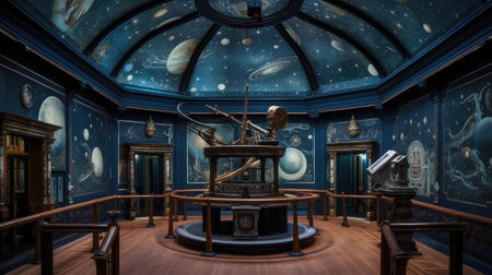 Interior of a modern astronomy exhibition with various telescopes on display, surrounded by educational posters of planets and stars, ideal for science enthusiasts.. AI Generation