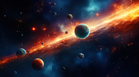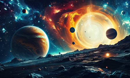 A breathtaking scene of a vast cosmic landscape featuring multiple planets and vibrant nebulae. The image captures the beauty of deep space with vivid colors and rich detail.