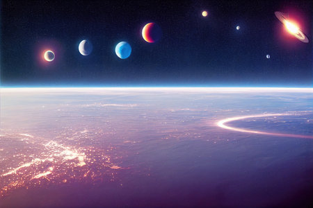 Generative ai on theme of parade of planets in solar system, bright stars glow in the atmosphere