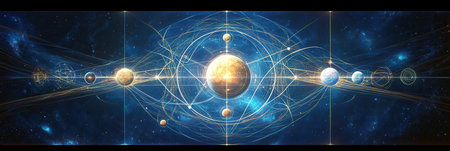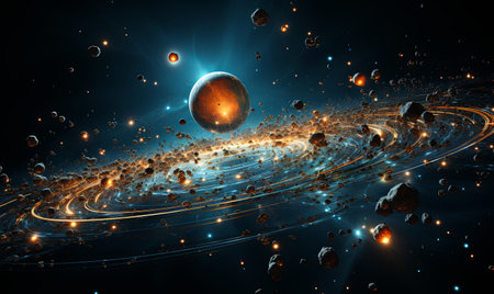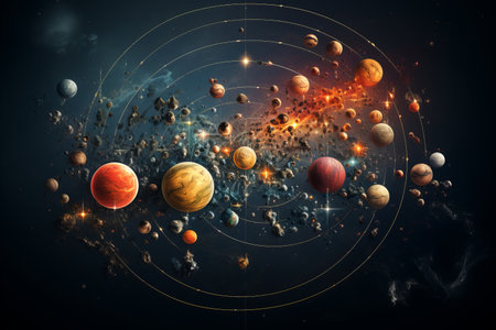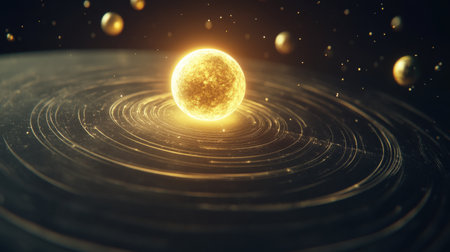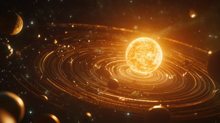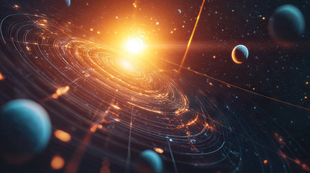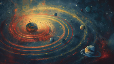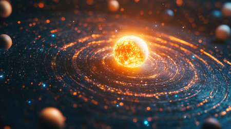 Stunning cosmic illustration depicting a glowing star at the center of an orbital path, surrounded by planets in a vibrant space scene filled with energy and light.
