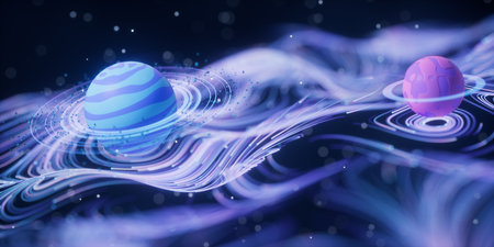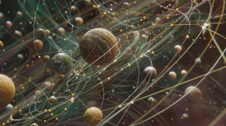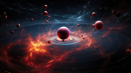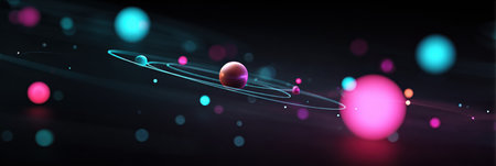 An abstract representation showcases floating spheres in various colors, dancing around an invisible center in a dark cosmic setting, evoking a sense of wonder.