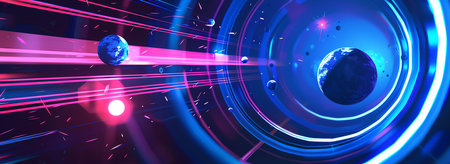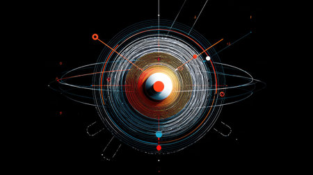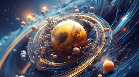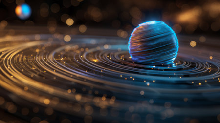 An abstract illustration shows a central orb encircled by luminous rings. The composition features a dark background that accentuates the glowing blue and orange outlines. This stylized artwork uses a digital rendering technique and could be used for conceptual design, science publications, or creative projects.