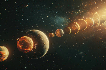 A digital rendering of a rare alignment of planets in a starry sky