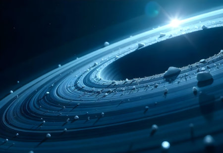 Cosmic dust and ice particles forming planetary rings around a giant planet, with a bright star shining in the background