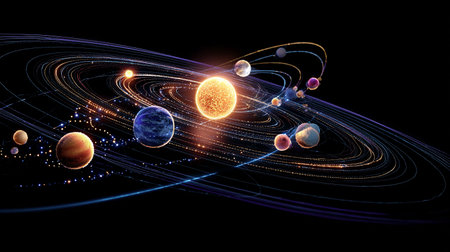 A stunning visual representation of the solar system featuring a radiant sun at the center, surrounded by colorful planets and swirling orbits, perfect for educational and creative projects.