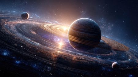 Explore a breathtaking cosmic scene featuring majestic planets and radiant rings, capturing the beauty and mystery of the universe's vast landscape.