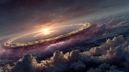 Breathtaking cosmic scene showcases a vibrant galaxy surrounded by clouds, capturing the beauty of the universe during a stunning sunset, evoking a sense of wonder.