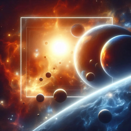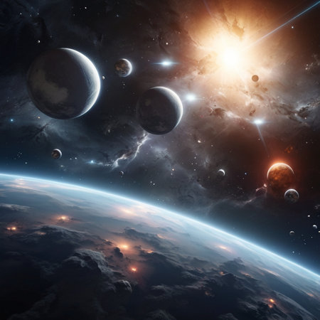 Vibrant celestial scene showcasing planets swirling around a luminous sun amid the vast darkness of interstellar space, evoking wonder and exploration