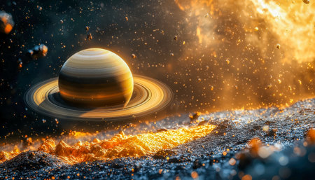 Saturn's majestic rings collide with a radiant cosmic burst, creating a vibrant explosion of light and color in deep space.