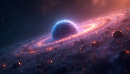 A vibrant cosmic swirl resembling a planetary ring, set against a glittering starfield with a tiny orbiting planet below, evoking celestial wonder.