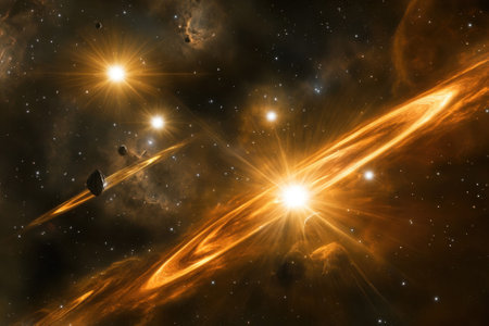 Bright stars illuminate swirling rings amidst a dark, expansive universe filled with cosmic dust and gas.