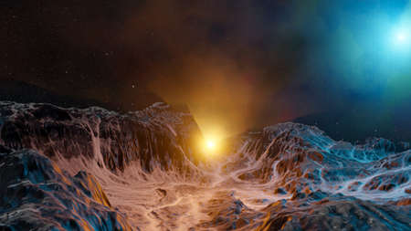 Fantasy alien planet. Mountain and sunset. 3D illustration.