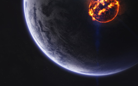 Planet explodin in space after meteorite impact. Planet hit by asteroid exploding. Dark space background apocalypse
