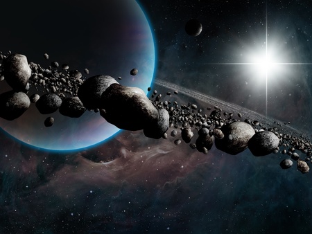 Rings and asteroids, Kuiper belt. Debris. Space and solar system. Rings around a planet. Worlds and universes to explore. New spatial observations and new discoveries. 3d render. Asteroids field aroun