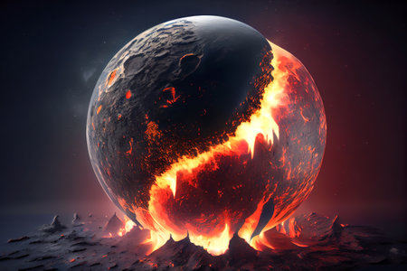 Fiery planet consisting of lava, with a cracking surface, a view from space. Generative AI.