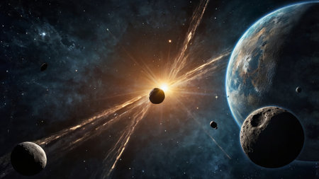 A 3D illustration of asteroids falling to Earth with stars in the background.